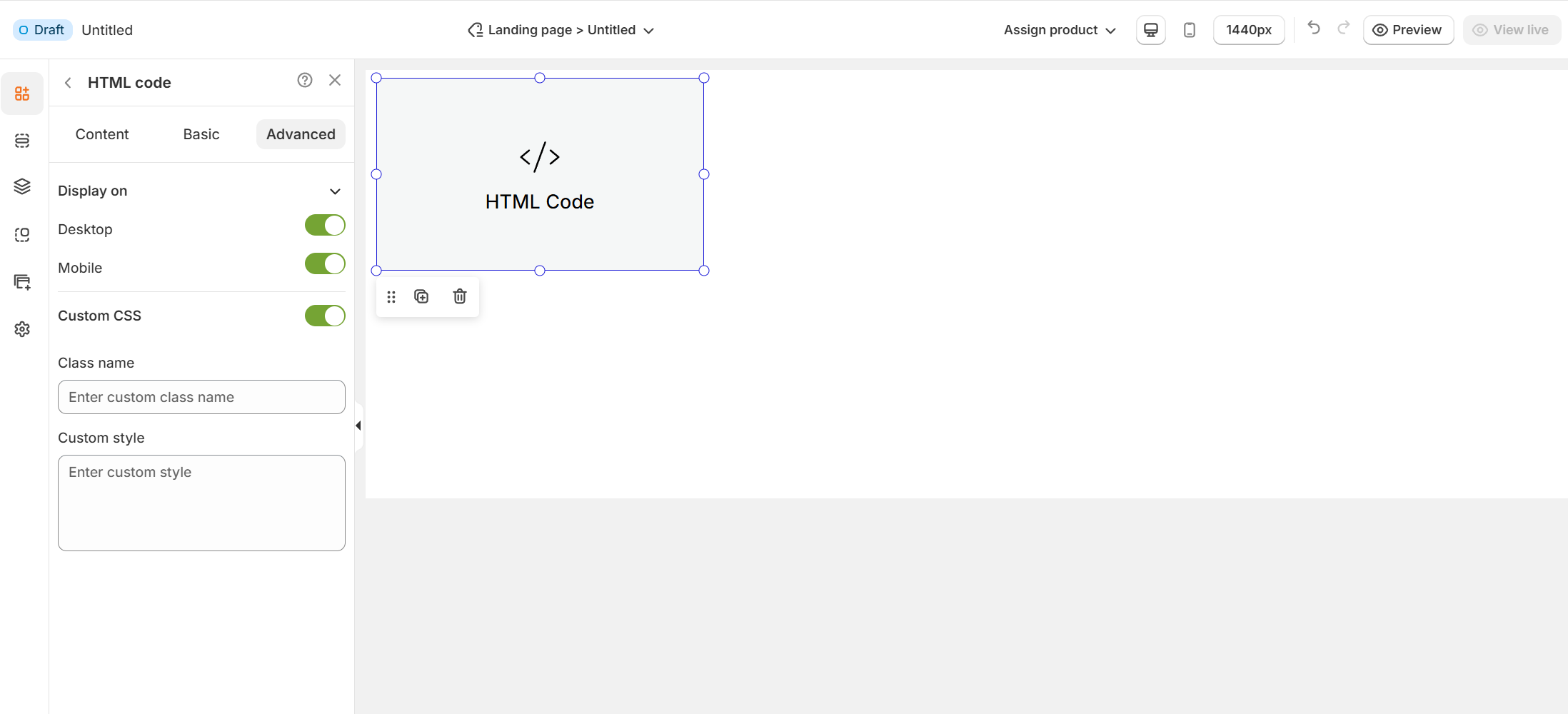 Desktop: Toggle ON/OFF to show or hide the code block on desktop screens.