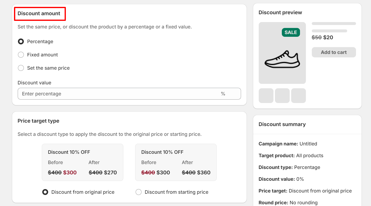 Step 3: Choose a discount amount (percentage, fixed amount, same price)
