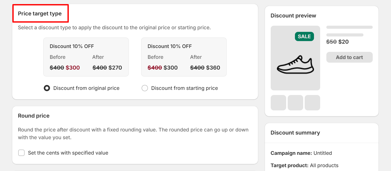 Step 4: Select a discount type to apply the discount to the original price or starting price
