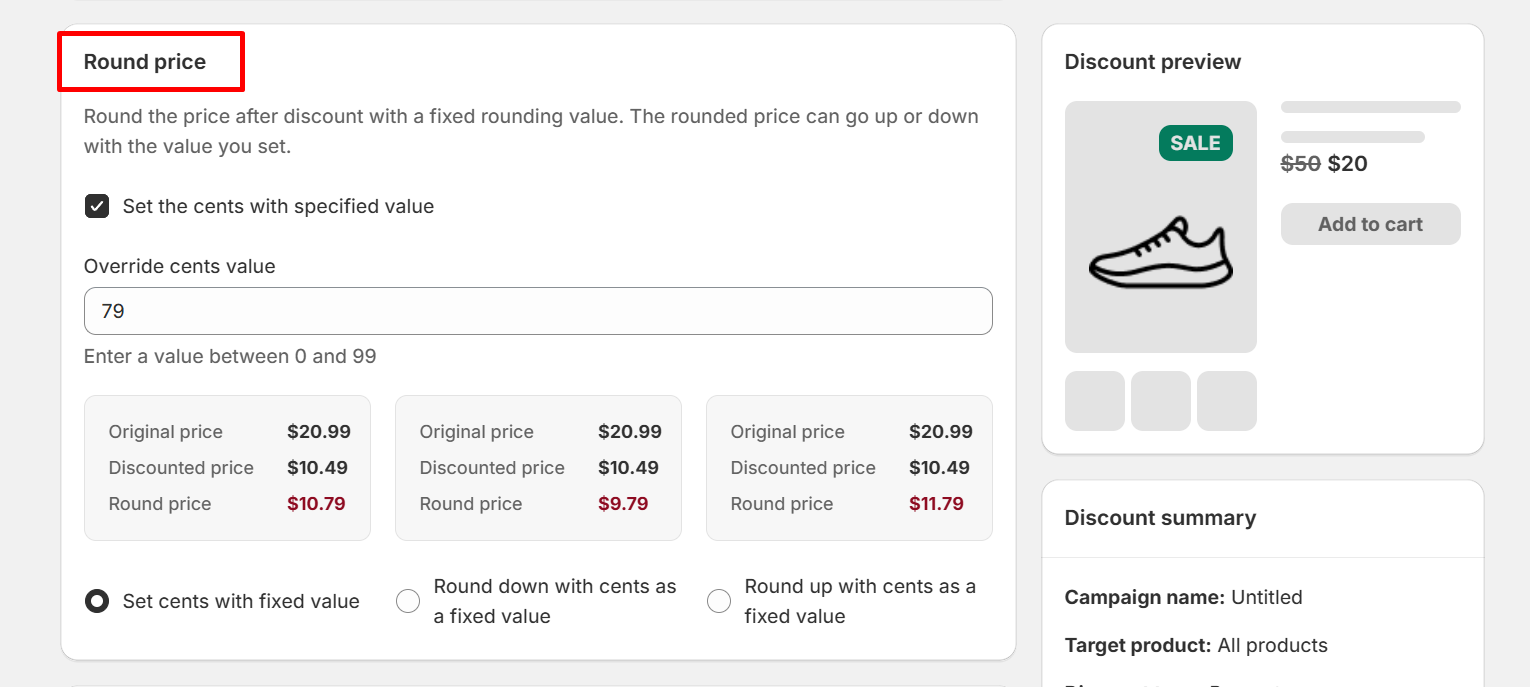 Round the price after discount with a fixed rounding value. The rounded price can go up or down with the value you set.