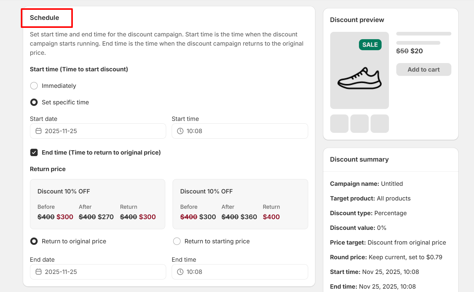 Set start time and end time for the discount campaign. Start time is the time when the discount campaign starts running. End time is the time when the discount campaign returns to the original price.