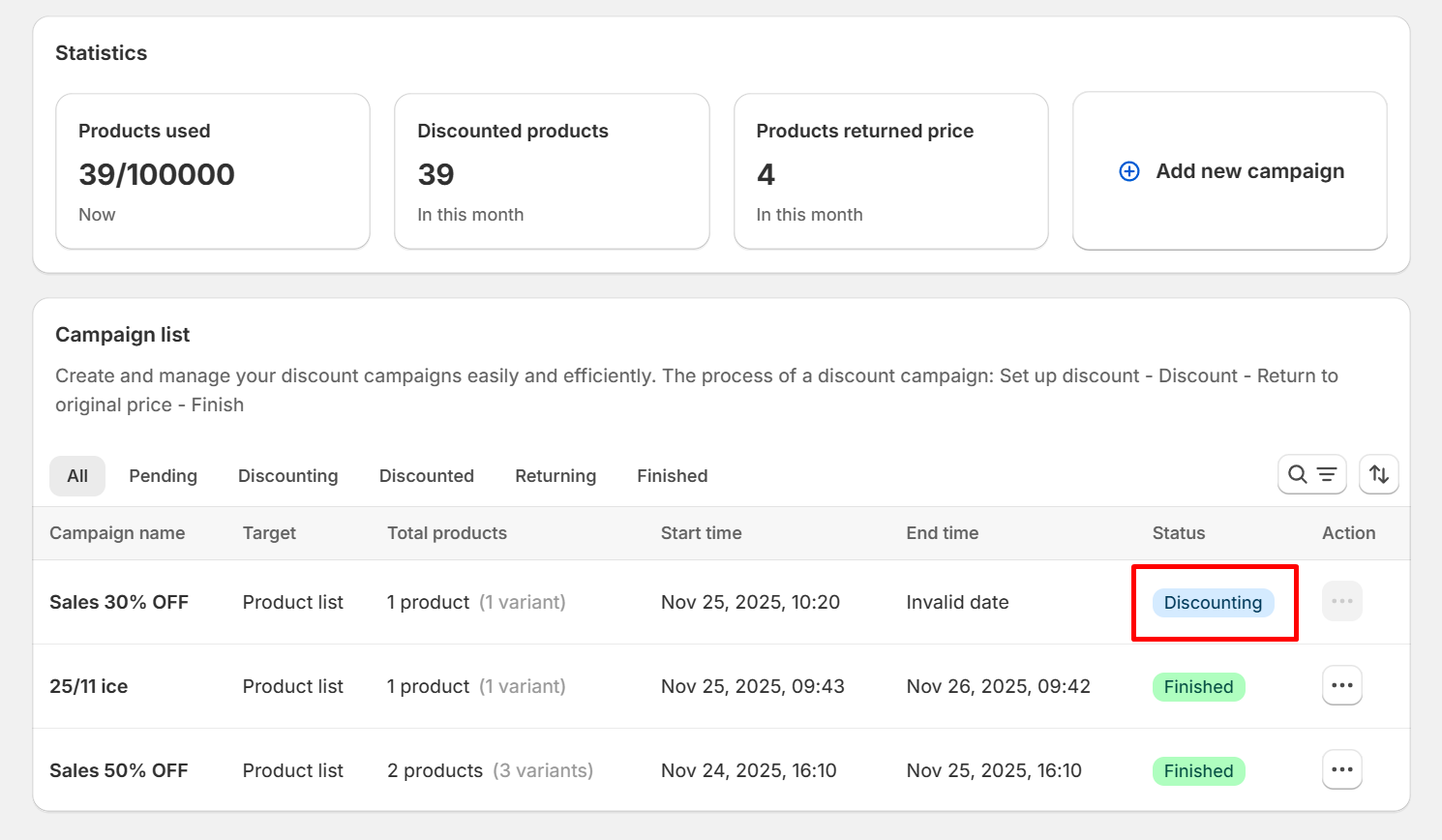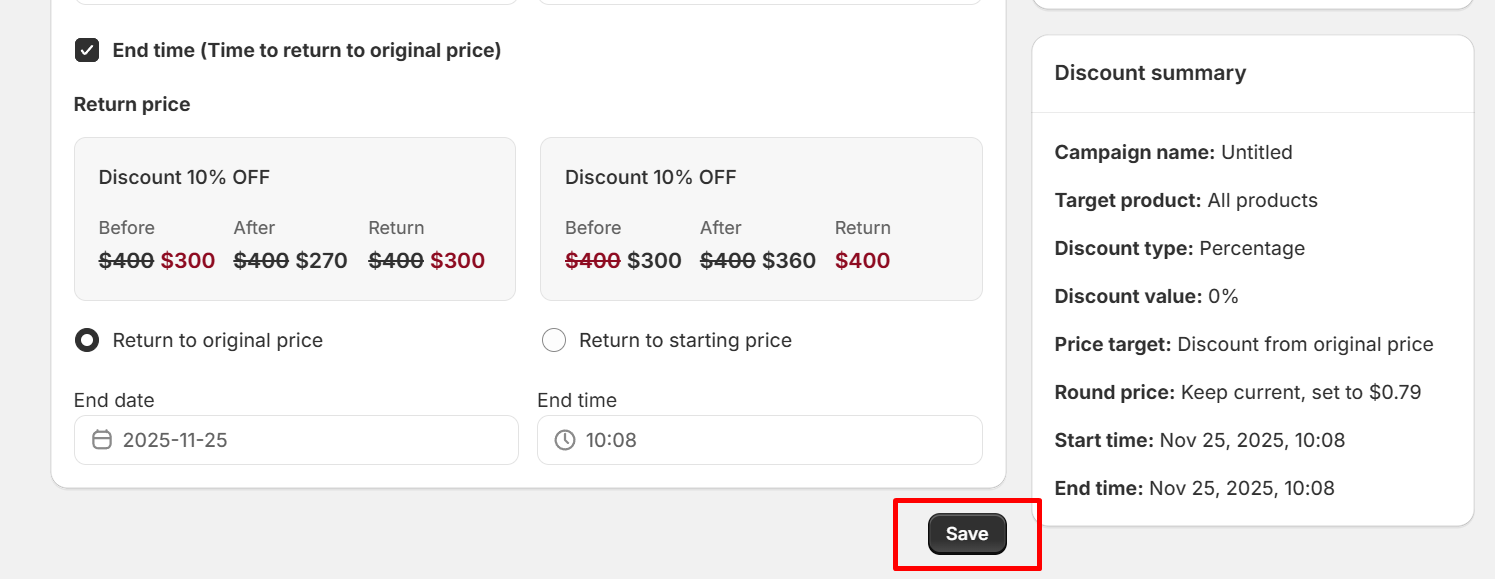 After the time you set to return to the original price or starting price, the discount campaign will automatically return to the original price and completely end the discount campaign.