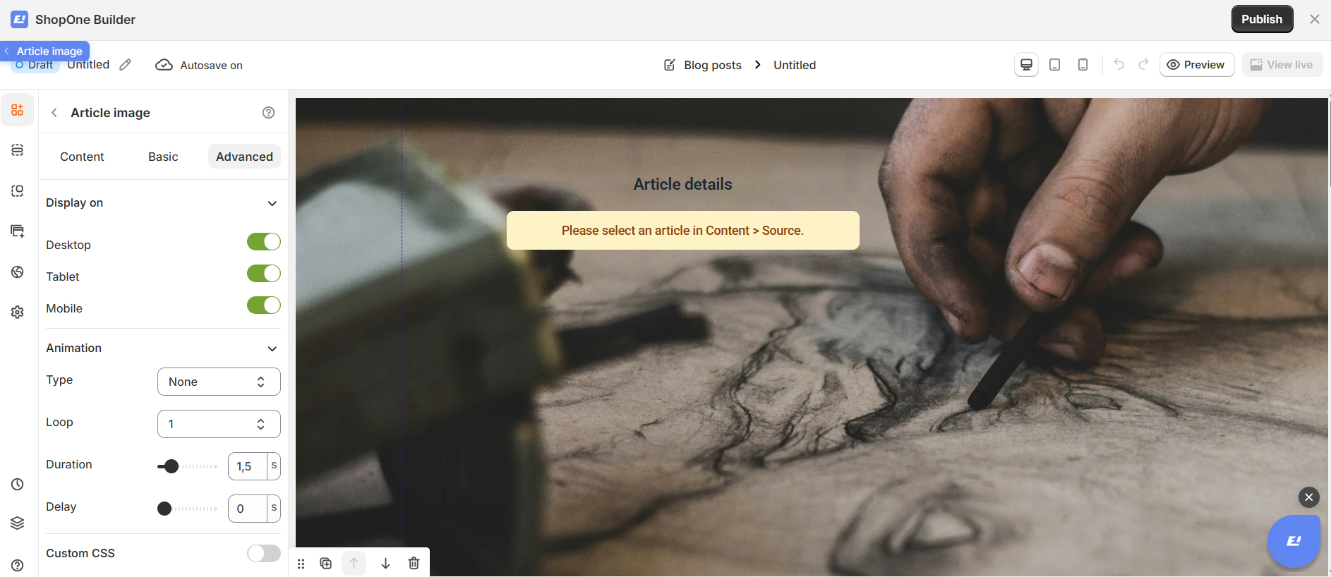 The Article Image element displays the featured image of a Shopify blog article. When used inside an Article Detail container, it automatically pulls the correct image from the selected article, keeping your blog layout dynamic and consistent.