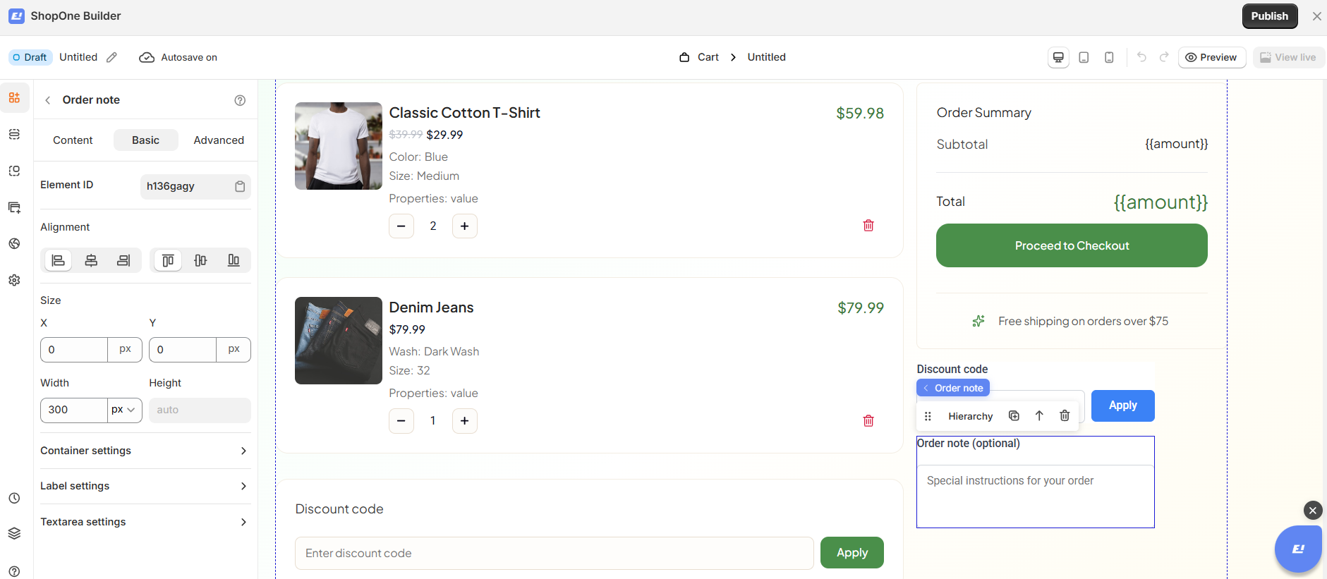 The Order Note element allows customers to add optional instructions or comments related to their order during checkout. This is useful for special requests such as delivery instructions, gift messages, or customization notes.